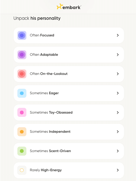 Embark’s Personality Quiz is designed to be educational and fun, helping you celebrate your dog’s unique behavior patterns in connection with their breed. It focuses on positive discovery, allowing pet parents to explore what motivates, excites, and defines their dog’s personality.