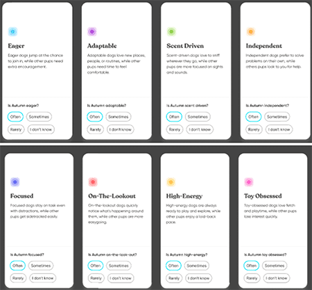 After completing the quiz, you’ll see your dog’s unique Personality Profile, which maps each of the eight traits as typical or atypical for their breed mix.